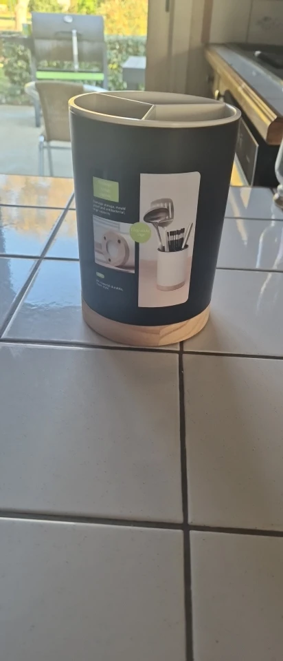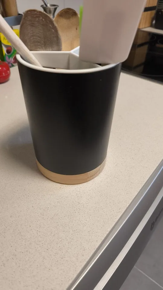 This minimalist utensil holder features a durable, thick-walled construction paired with a natural wood base for a clean, balanced look on your countertop.